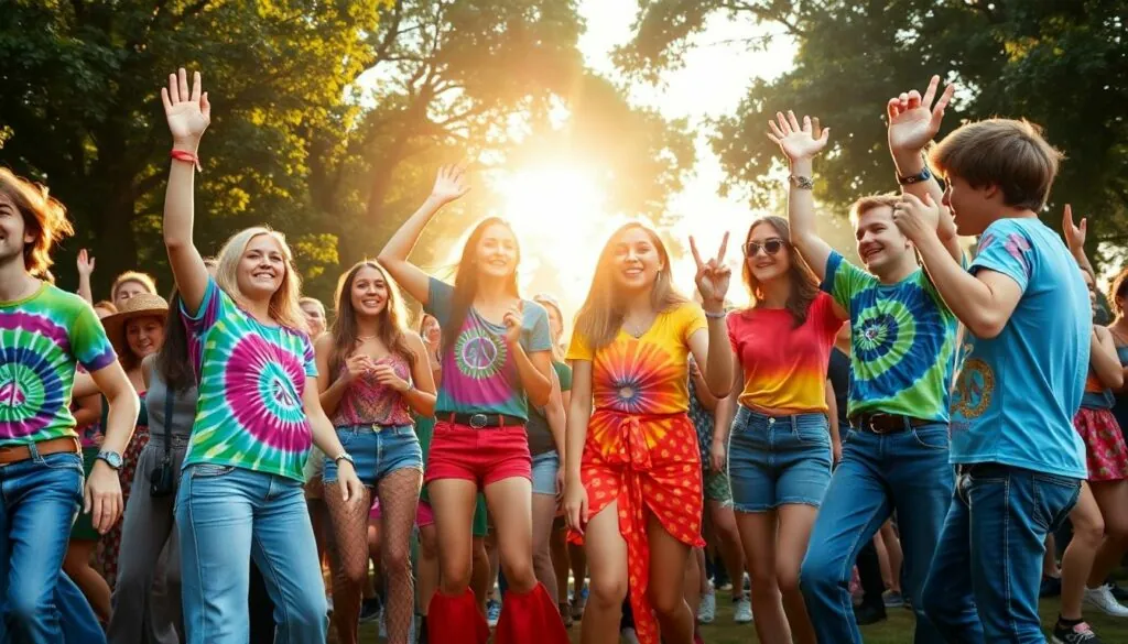Fashion trends flourished during this vibrant period. Youth embraced bell-bottoms, miniskirts, and tie-dye, symbolizing freedom and rebellion. Colorful accessories and peace signs became prominent, representing countercultural movements.